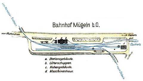 Gleisplanskizze des Bahnhofs Mügeln nach Einbindung der Strecke nach Nerchau-Trebsen im Jahre 1888.