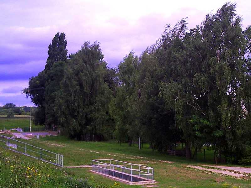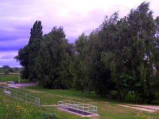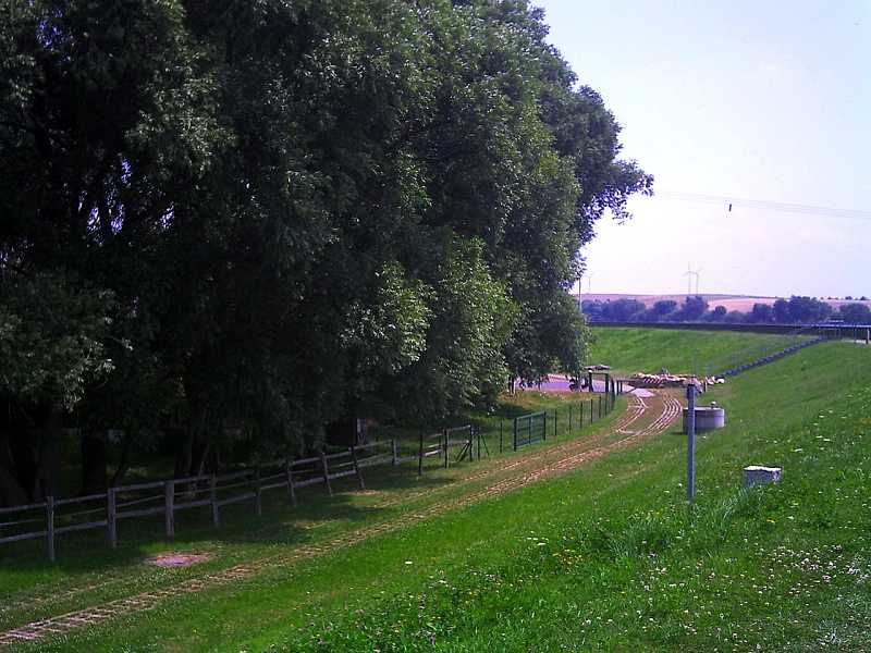 Bei den Bäumen verlief der Abfluss des Horstsees, der von der Bahn zwei Mal gekreuzt wurde; heute liegt er "hinter dem Deich".