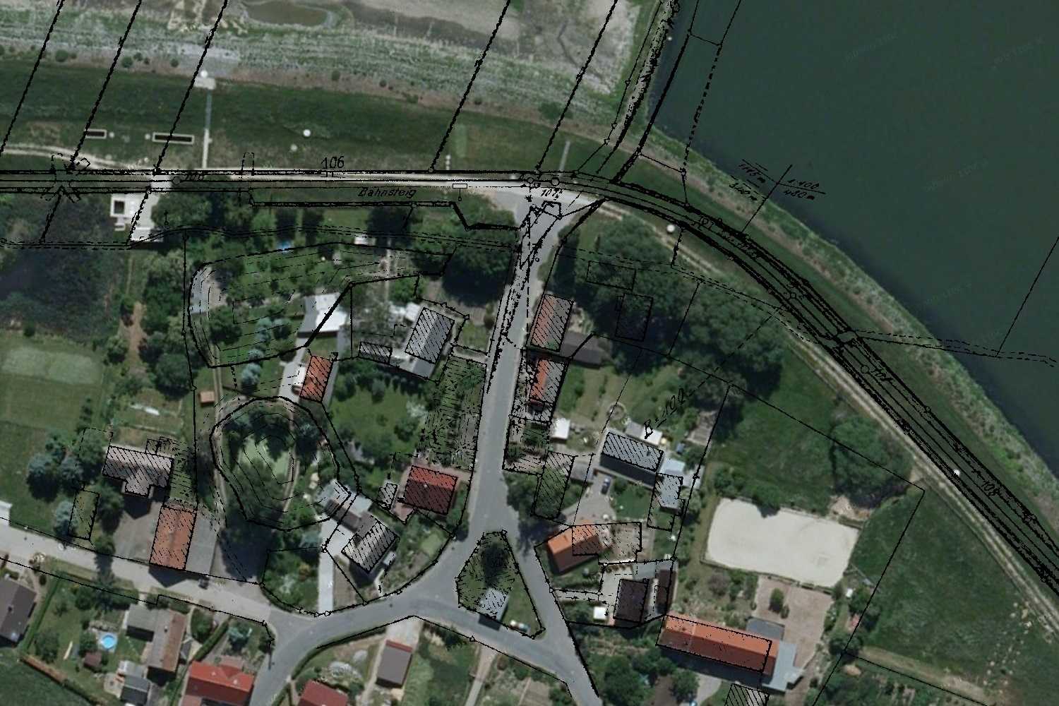 Die Konturen des oben abgebildeten Streckenbandes, auf das Google-Map-Luftbild von 2011 projiziert, zeigen die Lage des ehemaligen Haltepunktes in der umgestalteten Landschaft.