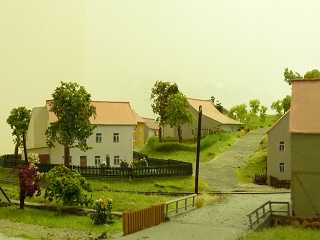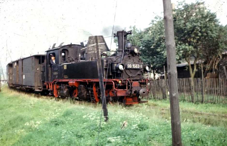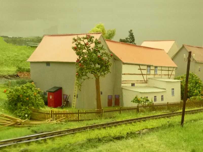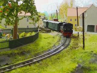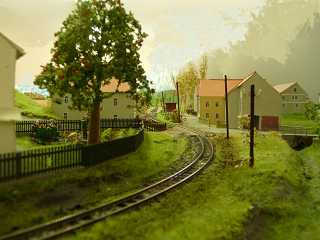 In weit ausholenden Bögen mit Radien herab bis zu 100 m schlängelte sich die Bahn zwischen den Häusern hindurch, verlief mitten über eine Straßenkreuzung und dann zwischen Weisskohlbeeten und Stachelbeerbüschen zur Einfahrtsweiche des Bahnhofs.