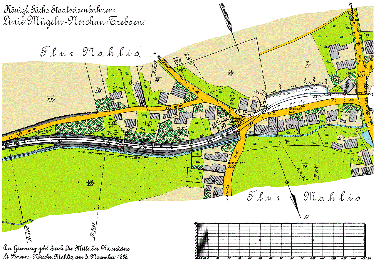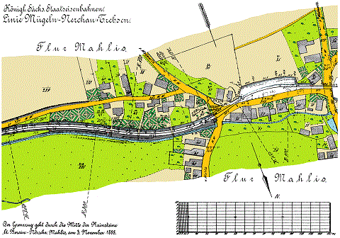 Diese Bahn berührt unsere in Mahlis bei Wermsdorf belegenen Grundstücke, welche unter der Grund-Cat. Nr. 63, 64, 65 und 70 eingetragen sind und war zeither zu 3½ Meter Entfernung zu unseren Wohnhäusern abgesteckt.