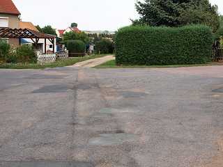 In regelmäßigen Abständen drücken sich die Bahnschienen durchs Asphalt-Flickwerk (hier in Blickrichtung Mügeln).