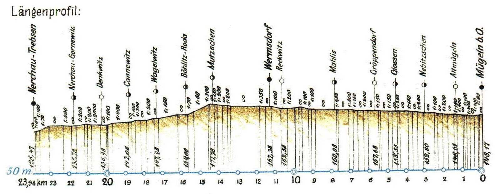 Längenprofil Mügeln – Nerchau-Trebsen, Verhältnis Höhen : Längen = 1 : 30.