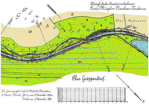 Der Streckenverlauf an der Mühlgrabenbrücke bei Bahn-km 6,190 MN.