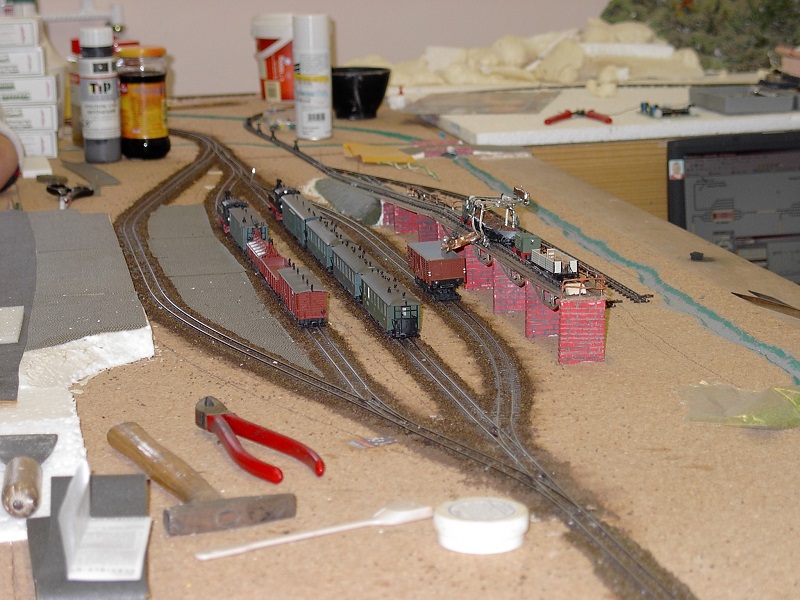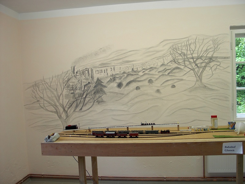 Unterm Kunstwerk steht der erste Rollwagenzug an der gedachten Seitenrampe. Weil noch nicht so recht zu erkennen ist, was das Ganze mal bedeuten soll, ist es vorsichtshalber angeschrieben.