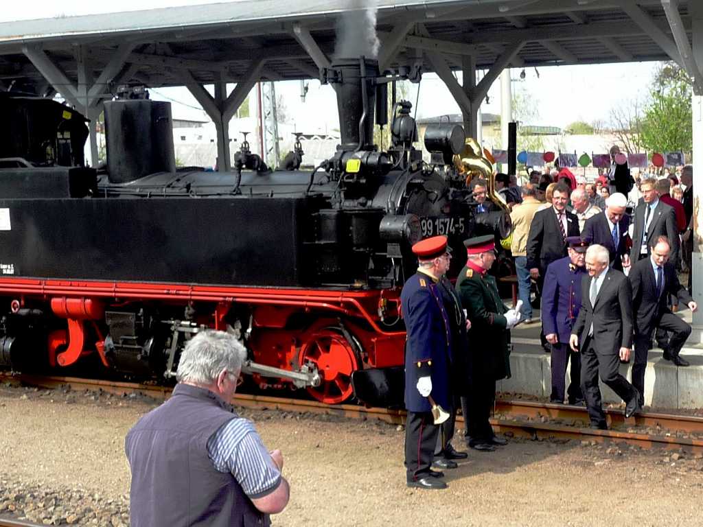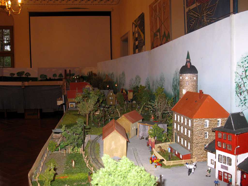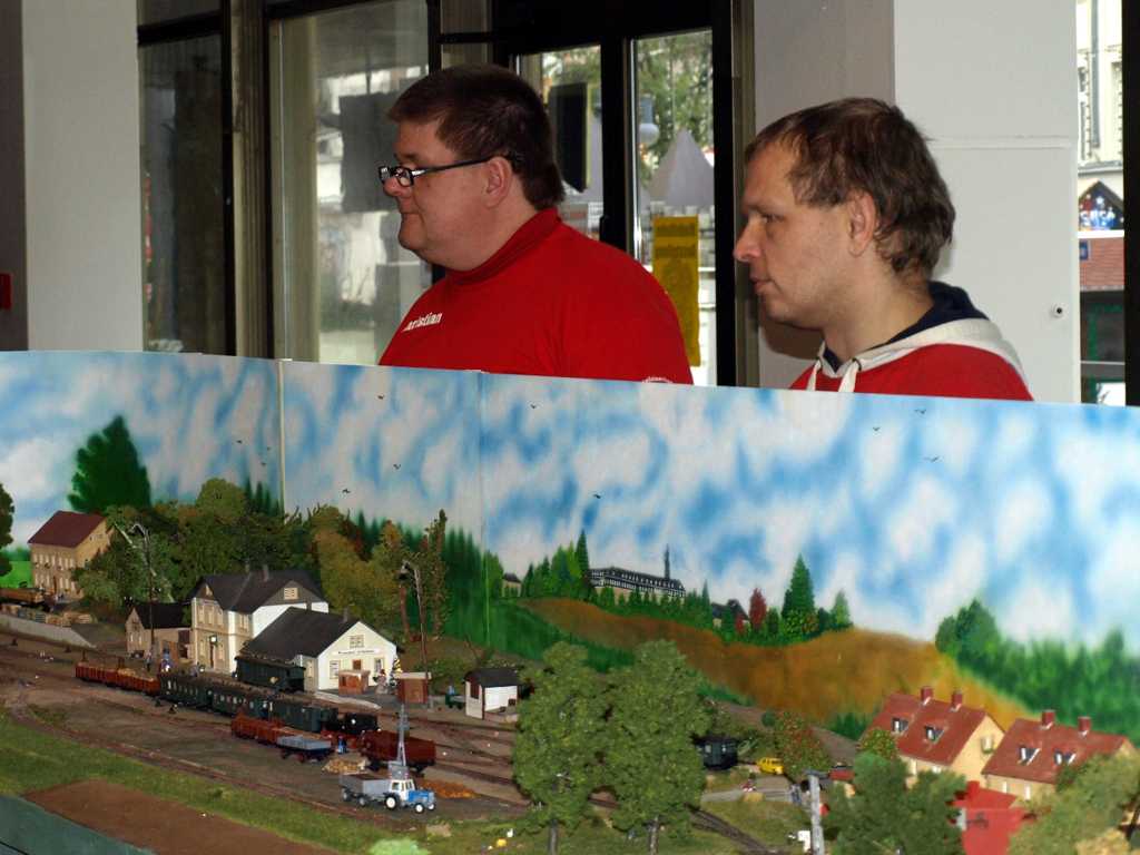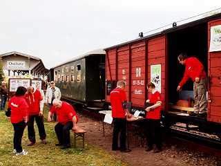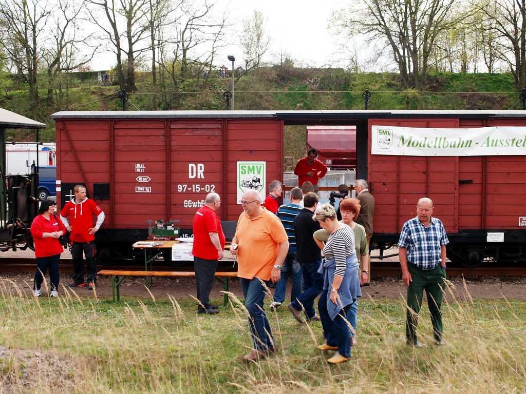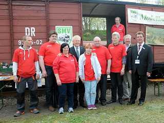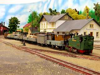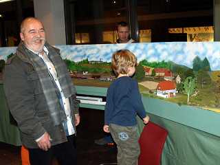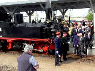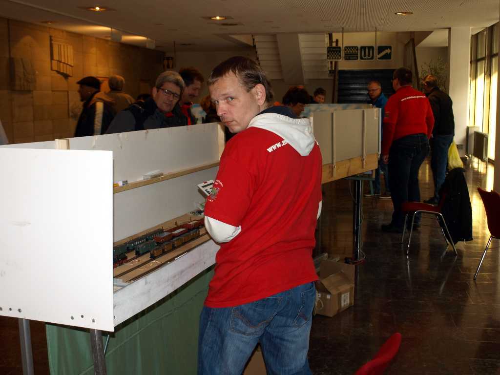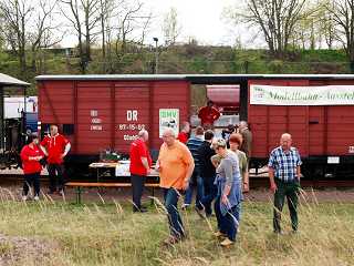 175 Jahre Leipzig – Dresdner EisenbahnAm 07. April war Start der Festwoche "175 Jahre erste deutsche Ferneisenbahn Leipzig – Dresden". Genau wie vor 175 Jahren fuhr ein Sonderzug die rund 120 Kilometer lange Strecke in dreieinhalb Stunden. Nur fuhr diesmal ein ICE 3 der DBAG; weil er aber die Strecke viel schneller als der Zug von 1839 zurückgelegt hätte, fanden in Wurzen, Oschatz und Riesa Bahnhofsfeste statt. Natürlich war bei den Feierlichkeiten auch die Sächsische Modellbahner-Vereinigung dabei und wurde durch regionale Vereine vertreten. In Oschatz waren wir für die Präsentation zuständig. In einem Schmalspur-GGw der Döllnitzbahn hatten wir ein Stück H0e-Anlage aufgebaut, viel Beachtung fanden auch unsere Foto-Wände. ![]() Mittags fuhren wir per Döllnitzbahn-Dampf-Sonderzug nach Oschatz. In den "Stückgut-Wagen" hatten wir bereits am Sonnabend unsere kleine Ausstellung verladen. ![]() …wurde in Vereins-typischer Arbeitsteilung am Oschatzer Schmalspur-Bahnsteig eine kleine Präsentation mit Mini-Modellbahn-Ausstellung aufgebaut. ![]() …dem "Star des Tages", dem neuen ICE 3 der DBAG erging es auch nicht besser, dafür defilierten all' seine Ehrenfahrgäste einschließlich Bahnchef Grube direkt an unserer Präsentation vorbei. ![]() DBAG-Vorstand Grube und Minister Morlok zeigten, was bei der Bahn verboten ist: Auf Schienenköpfe treten! OB Kretschmar, Landrat Czupalla und Döllnitzbahn-Chef Neidhardt (hinten v.l.) schwiegen höflich. Ostern mit IK-TreffenÜber Ostern war die IK № 54 zu Gast bei der Döllnitzbahn. Ostersonntag und -montag pendelte sie zwischen Mügeln und Glossen. Auch unsere Modellbahnanlage war an beiden Tagen für Besucher geöffnet, besonders am Sonntag konnten wir zahlreiche Besucher begrüßen. Ausstellung anlässlich des Mügelner AltstadtfestesAm 16. und 17. August fand in Mügeln das traditionelle Altstadtfest statt. Wir beteiligten uns erstmals mit einer Modelleisenbahnausstellung in den Räumlichkeiten des ehemaligen Schlecker-Marktes. Aufgebaut hatten wir die "lange" Strecke vom Horstsee bis zum Einfahrtssignal des Bahnhofes Mügeln, somit alle neugestalteten Segmente, ergänzt um Manfreds Privat-Teile. Unsere Ausstellung war an beiden Tagen für Besucher geöffnet, besonders am Sonnabend konnten wir zahlreiche Besucher begrüßen. A bis Z: Modellbahn in Gera und beim Lichtelfest in SchneebergErstmals in der Vereinsgeschichte brachte das zweite Adventswochenende ein Doppelereignis: Wir bestritten zur gleichen Zeit zwei Modellbahnausstellungen. Nahezu alle aktiven Vereinsmitglieder (von A bis Z) waren unterwegs. Während Gruppe (A)dler mit dem Bahnhof Wermsdorf zu Gast in der Ausstellung des Ostthüringer Modelleisenbahnclubs Gera e.V. war, nahm Gruppe (Z)immermann mit den Anlagensegmenten Nebitzschen – Altmügeln – Mügeln am Lichtelfest in Schneeberg teil. ![]() Gruppe A: Reiseleiter nebst Assistent regelten in Gera das Leben und den Zugverkehr in und um Wermsdorf. Und das natürlich aus dem Modellbahnhimmel… ![]() …während sich das sachkundige jugendliche Publikum - wie schon gewohnt - vor allem für das Leben im Untergrund interessierte. ![]() Da das rollende Material auf zwei Gruppen aufgeteilt war, musste alles eingesetzt werden, was Räder hatte. Manche Oma war begeistert: So ein schöner alter Zug! ![]() Vor den Anlagen herrschte meist regelrechtes Gedränge, während gegen Abend hinter den Kulissen das Feierabend-Bier herbeigesehnt wurde. ![]() Ein Blick zu den Nachbarn. Truppentransport der ehemaligen GSSD (Gruppe der Sowjetischen Streitkräfte in Deutschland) mit Rätsel: Wo endet die Anlage und wo beginnt die Hintergrundkulisse? ![]() Die Ausstellung stand unter dem Motto "Schmalspurbahn im Modell". Und so war die sächsische IVK die am häufigsten zu sehende Lok. Nicht nur bei uns, sondern auch eine Nummer größer in 0e… ![]() …oder wie hier bei den Cottbuser Modellbahnfreundeen auf dem großen Stützengrüner Viadukt in H0e. ![]() Auch eine Erinnerung an die Glossener Heimat gab es zu sehen: Gesteinstransport auf drei Spurweiten in 1:45, also 0f, 0e und 0. ![]() Hier feierte Manfreds Bahnhof Mügeln seine Premiere, die Fassadenfarbe des großen Empfangsgebäudes war gerade noch rechtzeitig trocken geworden. Weihnachtsmarkt in StauchaSchlusspunkt des Ausstellungsmarathons war der Weihnachtsmarkt in Staucha. Ausstellungsort und Unterstützung durch die Gemeinde sind vorbildlich. Jedoch haben Modellbahnausstellungen anlässlich von Weihnachtsmärkten einen Haken: So mancher Zeitgenosse trinkt doch lieber ein-zwei-drei Becherchen Glühwein für rund 5,00 Euro und zeigt dem Kassierer am Eingang einen Vogel, wenn er 1,50 Euronen Eintritt berappen soll. Man muss halt Prioritäten setzen! Deutschland war angeblich mal eine Geistes-Nation, so mit Dichtern und Denkern. Davon sind offensichtlich nur die geistigen Getränke übrig geblieben… |