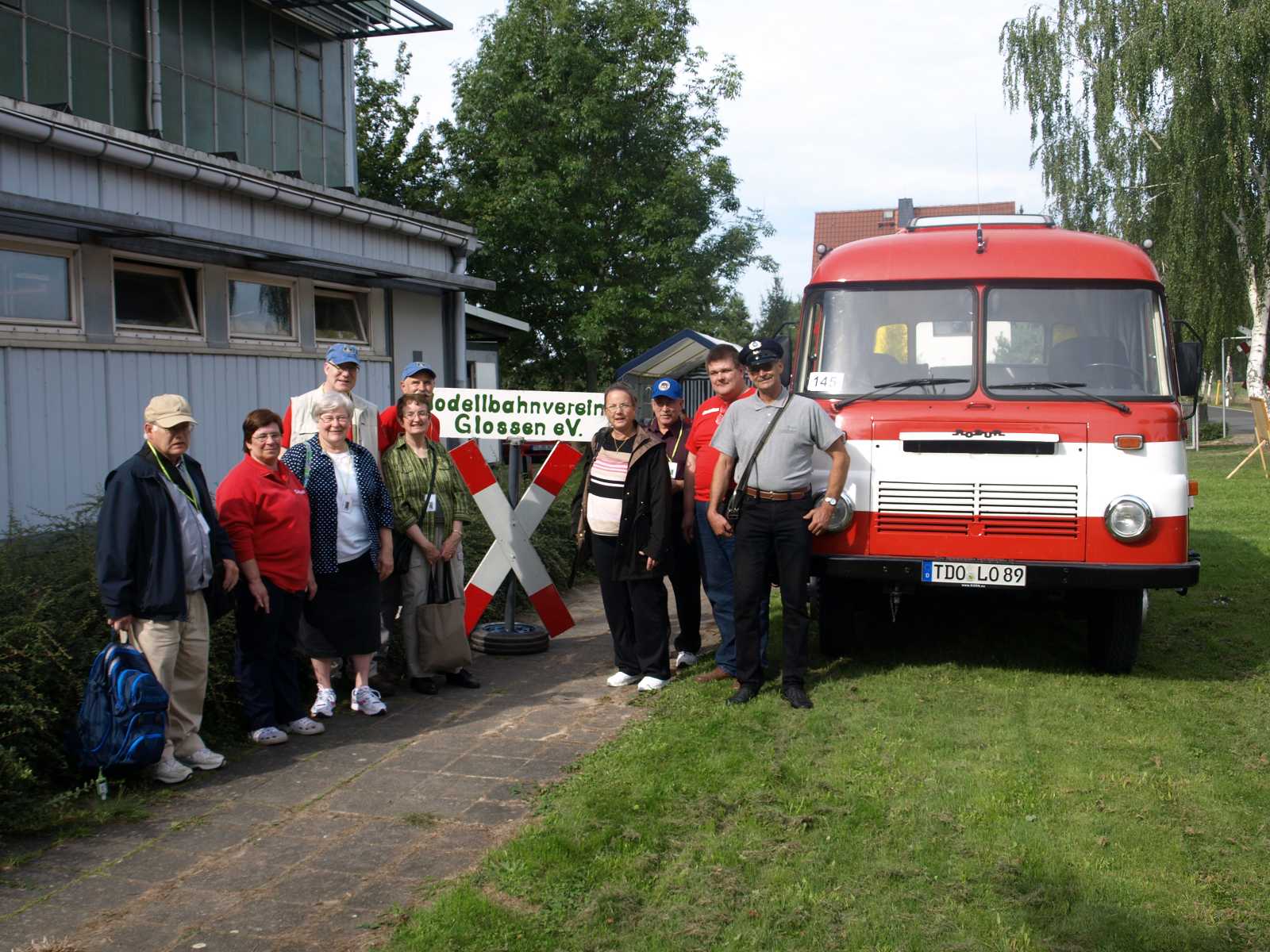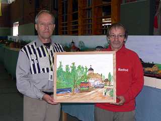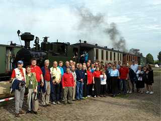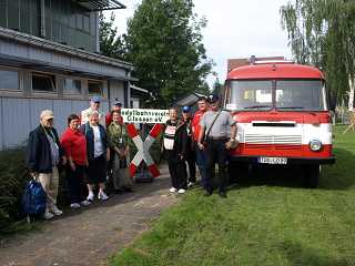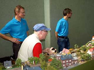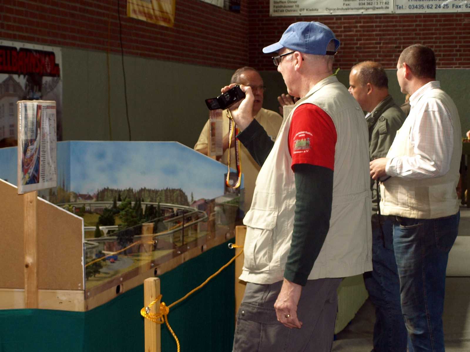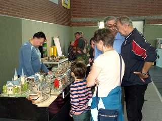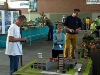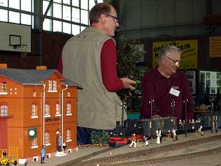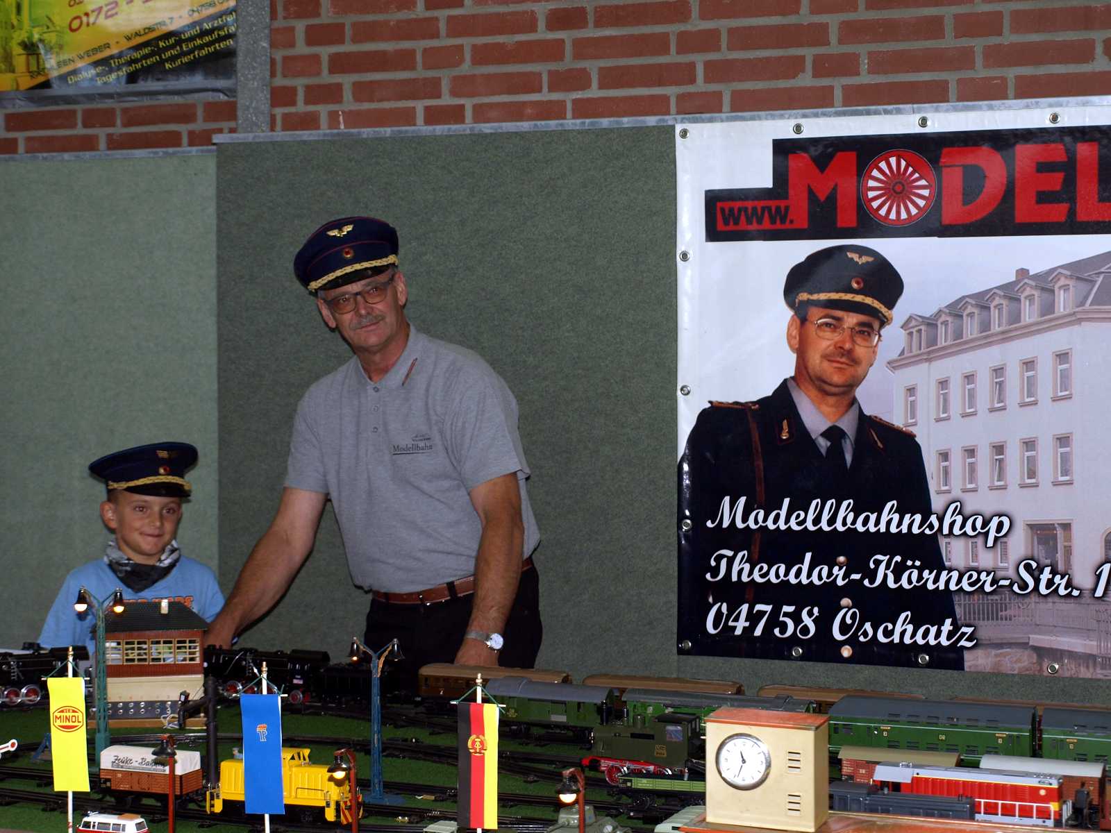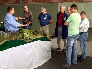Auf dieser Seite finden Sie……Bilder der großen Modelleisenbahnausstellung in Naundorf am 12. und 13. September 2015. Im Jahre 2015 feierten wir das zehnjährige Bestehen unseres Vereins. Aus diesem Anlass wurde eine große Modelleisenbahnausstellung in der Sporthalle Naundorf geplant. Diese fand schließlich am 12. und 13. September statt, zeitgleich mit dem Mügelner Bahnhofsfest. Auch die Döllnitzbahn hatte Grund zum Feiern: Anno 1885 wurde der Streckenabschnitt Oschatz - Mügeln eröffnet, bestand also seit genau 130 Jahren. Aber lassen wir einfach Bilder sprechen… ![]() Jubiläen sind immer Anlass für Rückblick und Reden halten. Hier unser Gründungsvater und langjähriger Vorsitzender Wolfgang bei seiner mit viel Applaus bedachten Ansprache. ![]() Geburtstag heißt aber auch: Geburtstagsgeschenke entgegennehmen! (An sich ein Grund zur Freude, aber nicht jeder hat ein Fotogesicht.) ![]() Und natürlich: Geburtstagstorte! Hier unsere Küchen-Mamsell beim Anschneiden. Und der Küchen-Junge freut sich schon. (Kein Wunder, dass die Torte so schnell "verkauft" war…) ![]() Ja und Geburtstagsgäste! Wer zählt die Völker, nennt die Namen, die gastlich hier zusammenkamen? IK № 54, Sachsenzug, Modellbahner aus Brandenburg, Pennsylvania, Sachsen, Thüringen… ![]() Die Freunde vom Modelleisenbahn-Club "Lößnitzgrund" e.V. zeigten eine wohl einmalige Anlage: Sächsische Scmalspurbahn im exakten Maßstab 1 : 22,5 = IIe. ![]() Am anderen Ende der Maßstabsskala - die Modellbahn des Chemnitzer Clubs der Gehörlosen. Klein aber fein! Kein Wunder, dass sie oft dicht umlagert war! ![]() Doppel-Korn mit Nachfolger: Unser Haus- und Hoflieferant zeigte seiner 0-Anlage. Ralf sind wir zu besonderem Dank verpflichtet, er betreute zeitweise unsere amerikanischen Gäste, … ![]() …fuhr sie in seinem historischen Robur-Bus zu Sehenswürdigkeiten unseres Landkreises. Sogar die Eisenbahner-Dienstmütze hatte er gegen eine des VEB Kraftverkehr getauscht! ![]() Hier kam keiner ungeschröpft vorbei: Die Empfangstheke war mit Strichlistenschreiber, Kassiererin und Kartenabreißer ausgesprochen kompetent besetzt. ![]() Alex - der mit den Rollwagen-Kuppelstangen kämpft. In 1 : 1 ist das harte Männerarbeit (deshalb spricht man auch von "Kuppelbäumen"), in 1 : 87 eher eine Sache der Nerven! ![]() Die Anlage der Cottbuser Schmalspurfreunde: Reichsbahn pur zu Ulbrichts Zeiten! Dennoch wird sie nicht vollumfänglich den Grundsätzen der marxistisch-leninistischen Weltanschauung gerecht. ![]() "Und da gab's solche dicken Steaks!" Rolf von den Cottbusern hat schon jeden sächsichen Schmalspurwagen als Karton-Modell gebaut, ist aber auch gefragter Kenner der Catering-Szene. ![]() Mario jedenfalls hat im Schweiße seines Angesichts alles getan, um die Gaumen der erlesenen Gäste zu verwöhnen. ![]() Da machte sich nachmittags der Drang nach einem Mittagsschläfchen bemerkbar. Bei den Hainichener Modellbahnern war das aber kein Problem, der Zugverkehr lief auch so perfekt! ![]() Volle Konzentration dagegen bei den Suhler Freunden - Auch unser amerikanischer Gast Tim hat sich mit Fotoapparat bewaffnet am Schienenstrang postiert und schaut ganz gebannt. ![]() Und auch das hat Amerika noch nicht gesehen: Eine Einschienbahn! Kein Wunder, ist es doch weltweit die vielleicht einzige noch betriebsfähige Anlage zum Thema Piko-Einschienbahn! ![]() Ja und schließlich gab's noch eine Anlage ganz ohne Modellbahn: Die 1:87-Feuerwehr unserer Kollegen aus Mühltroff. Es war nicht einfach, die kleinen "Tatütatas" unfallfrei zum Einsatzort zu lotsen… ![]() …ein besonderer Gaudi war's dennoch, und sogar unser eigener Modellbahnnachwuchs ist "fremdgegangen"…
