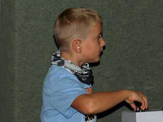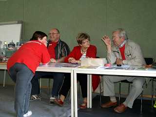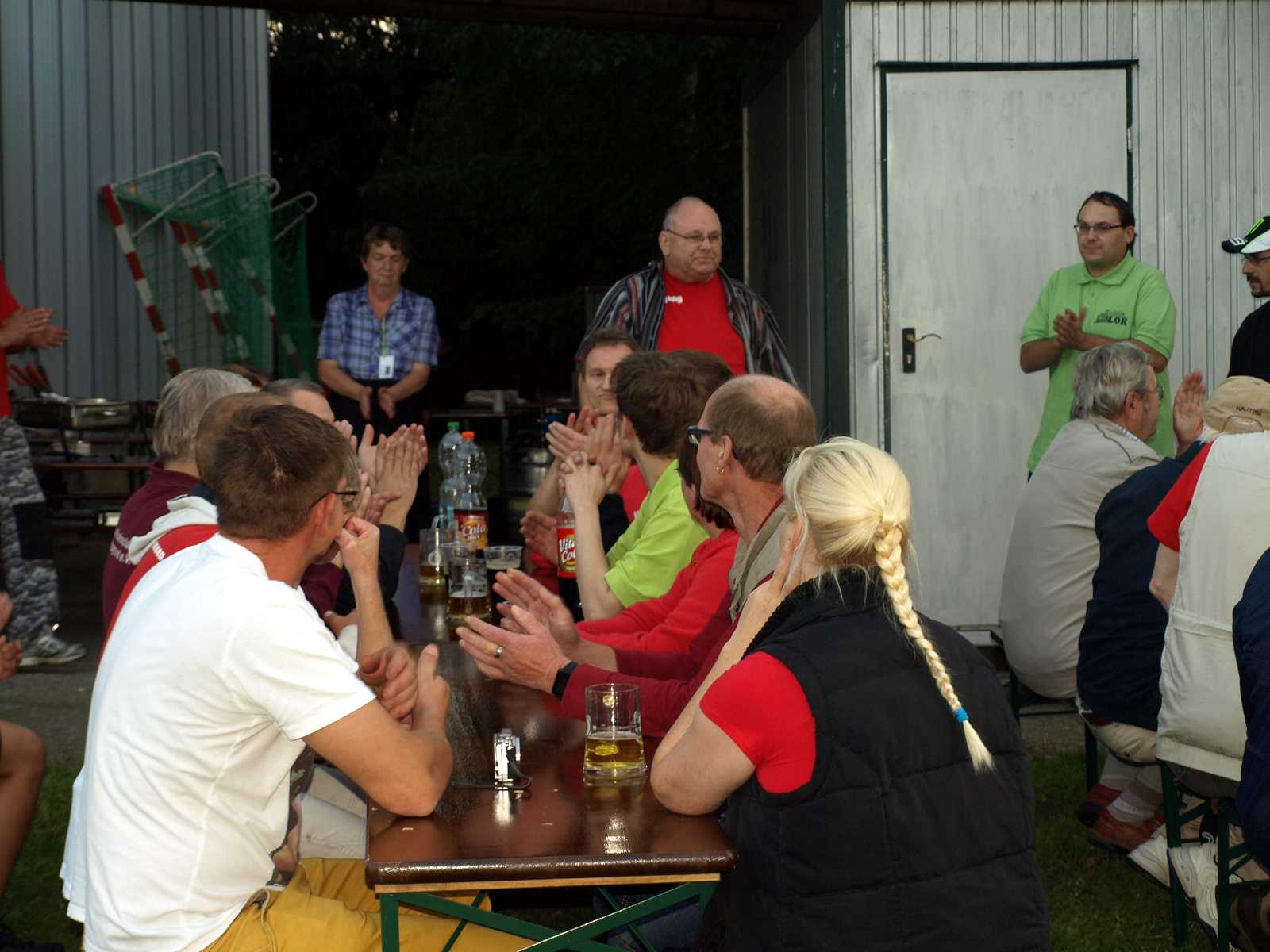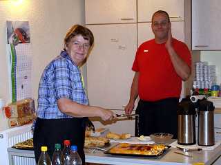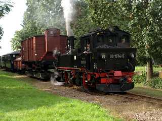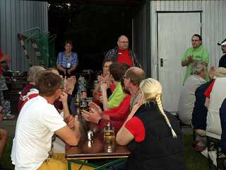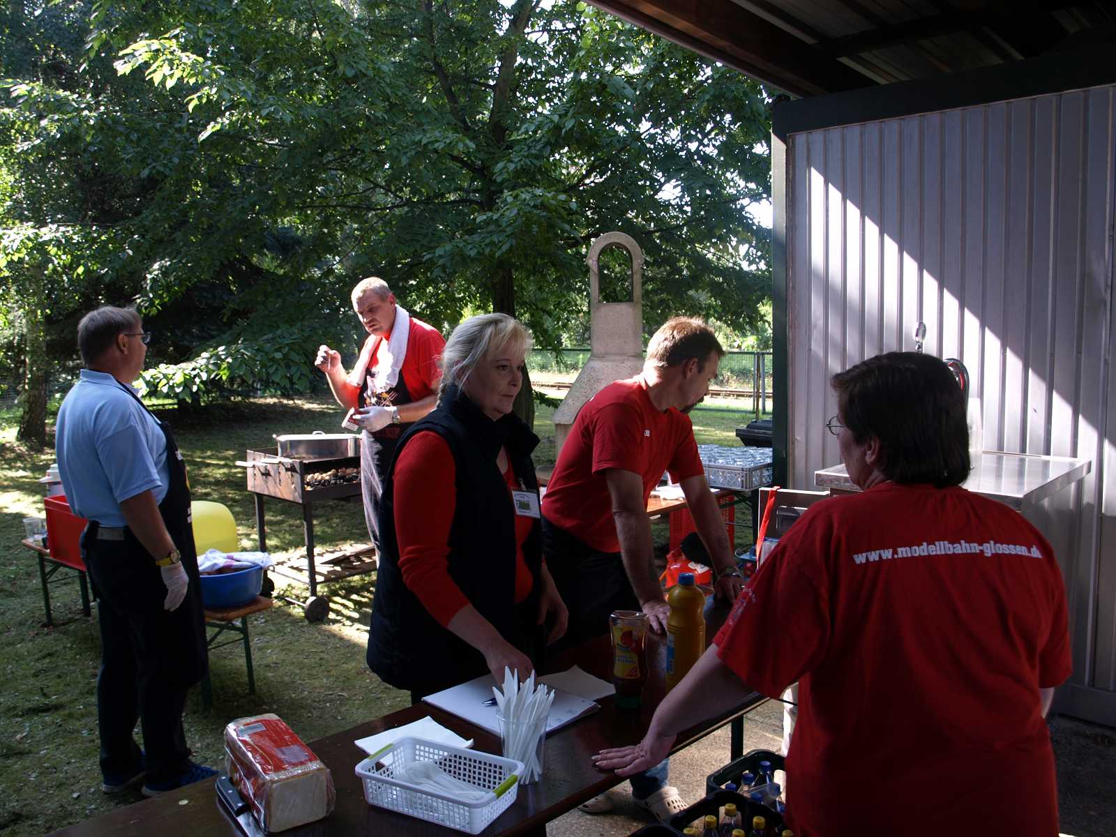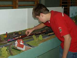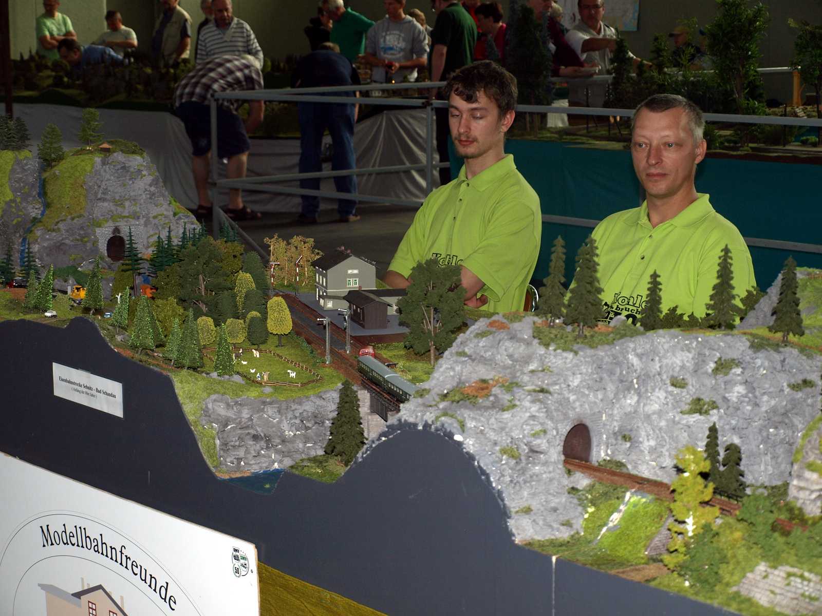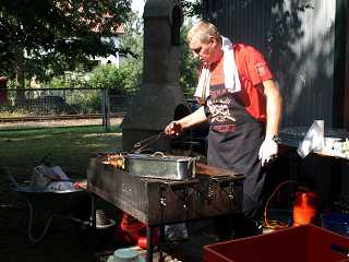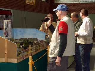 Auf dieser Seite finden Sie……Bilder der großen Modelleisenbahnausstellung in Naundorf am 12. und 13. September 2015. Im Jahre 2015 feierten wir das zehnjährige Bestehen unseres Vereins. Aus diesem Anlass wurde eine große Modelleisenbahnausstellung in der Sporthalle Naundorf geplant. Diese fand schließlich am 12. und 13. September statt, zeitgleich mit dem Mügelner Bahnhofsfest. Auch die Döllnitzbahn hatte Grund zum Feiern: Anno 1885 wurde der Streckenabschnitt Oschatz - Mügeln eröffnet, bestand also seit genau 130 Jahren. Aber lassen wir einfach Bilder sprechen… ![]() Jubiläen sind immer Anlass für Rückblick und Reden halten. Hier unser Gründungsvater und langjähriger Vorsitzender Wolfgang bei seiner mit viel Applaus bedachten Ansprache. ![]() Geburtstag heißt aber auch: Geburtstagsgeschenke entgegennehmen! (An sich ein Grund zur Freude, aber nicht jeder hat ein Fotogesicht.) ![]() Und natürlich: Geburtstagstorte! Hier unsere Küchen-Mamsell beim Anschneiden. Und der Küchen-Junge freut sich schon. (Kein Wunder, dass die Torte so schnell "verkauft" war…) ![]() Ja und Geburtstagsgäste! Wer zählt die Völker, nennt die Namen, die gastlich hier zusammenkamen? IK № 54, Sachsenzug, Modellbahner aus Brandenburg, Pennsylvania, Sachsen, Thüringen… ![]() Die Freunde vom Modelleisenbahn-Club "Lößnitzgrund" e.V. zeigten eine wohl einmalige Anlage: Sächsische Scmalspurbahn im exakten Maßstab 1 : 22,5 = IIe. ![]() Am anderen Ende der Maßstabsskala - die Modellbahn des Chemnitzer Clubs der Gehörlosen. Klein aber fein! Kein Wunder, dass sie oft dicht umlagert war! ![]() Doppel-Korn mit Nachfolger: Unser Haus- und Hoflieferant zeigte seiner 0-Anlage. Ralf sind wir zu besonderem Dank verpflichtet, er betreute zeitweise unsere amerikanischen Gäste, … ![]() …fuhr sie in seinem historischen Robur-Bus zu Sehenswürdigkeiten unseres Landkreises. Sogar die Eisenbahner-Dienstmütze hatte er gegen eine des VEB Kraftverkehr getauscht! ![]() Hier kam keiner ungeschröpft vorbei: Die Empfangstheke war mit Strichlistenschreiber, Kassiererin und Kartenabreißer ausgesprochen kompetent besetzt. ![]() Alex - der mit den Rollwagen-Kuppelstangen kämpft. In 1 : 1 ist das harte Männerarbeit (deshalb spricht man auch von "Kuppelbäumen"), in 1 : 87 eher eine Sache der Nerven! ![]() Die Anlage der Cottbuser Schmalspurfreunde: Reichsbahn pur zu Ulbrichts Zeiten! Dennoch wird sie nicht vollumfänglich den Grundsätzen der marxistisch-leninistischen Weltanschauung gerecht. ![]() "Und da gab's solche dicken Steaks!" Rolf von den Cottbusern hat schon jeden sächsichen Schmalspurwagen als Karton-Modell gebaut, ist aber auch gefragter Kenner der Catering-Szene. ![]() Mario jedenfalls hat im Schweiße seines Angesichts alles getan, um die Gaumen der erlesenen Gäste zu verwöhnen. ![]() Da machte sich nachmittags der Drang nach einem Mittagsschläfchen bemerkbar. Bei den Hainichener Modellbahnern war das aber kein Problem, der Zugverkehr lief auch so perfekt! ![]() Volle Konzentration dagegen bei den Suhler Freunden - Auch unser amerikanischer Gast Tim hat sich mit Fotoapparat bewaffnet am Schienenstrang postiert und schaut ganz gebannt. ![]() Und auch das hat Amerika noch nicht gesehen: Eine Einschienbahn! Kein Wunder, ist es doch weltweit die vielleicht einzige noch betriebsfähige Anlage zum Thema Piko-Einschienbahn! ![]() Ja und schließlich gab's noch eine Anlage ganz ohne Modellbahn: Die 1:87-Feuerwehr unserer Kollegen aus Mühltroff. Es war nicht einfach, die kleinen "Tatütatas" unfallfrei zum Einsatzort zu lotsen… ![]() …ein besonderer Gaudi war's dennoch, und sogar unser eigener Modellbahnnachwuchs ist "fremdgegangen"…